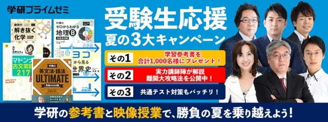 新型コロナウイルスの影響による休校や夏休み短縮、初めて実施される共通テストなど、例年以上に大変な夏を迎える皆さんをサポートするため、学研プライムゼミでは“受験生応援3大キャンペーン”を開催します! 参考書プレゼントや実力講師の動画公開、お得な期間限定セット講座の配信など、受験生の皆さんに役立つ企画を盛りだくさんでお届けします。このキャンペーンを活用して、「勝負の夏」を乗り切りましょう。