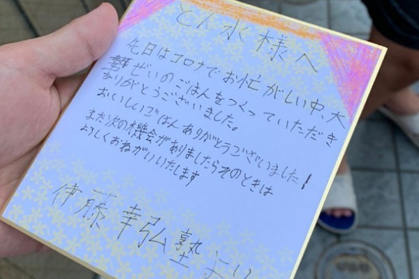 1軒1軒、お店を回って、声に出して、感謝の気持ちを伝えました。お礼のマスクと色紙も渡しました。
