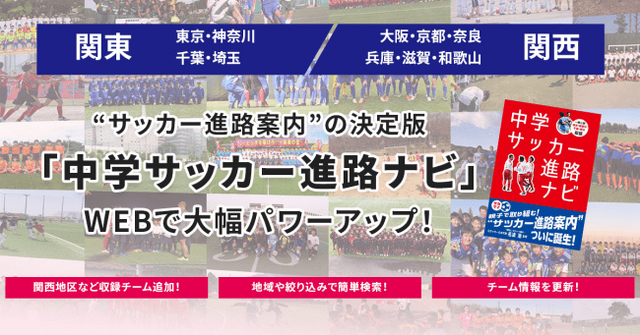 サッカー業界初の“進路案内本"として1都3県(東京・神奈川・千葉・埼玉)のクラブチーム情報を網羅した書籍『中学サッカー進路ナビ』が、スポーツキッズ・子育て支援メディア「サカママ」のWEB版のサービスとしてパワーアップ! 書籍掲載内容から新たに関西の2府4県(大阪・京都・奈良・兵庫・滋賀・和歌山)のクラブチーム情報を追加し、掲載地域を拡大。書籍ではできなかったカンタン検索機能により、目的に合ったチーム選びができるようになり、より多くの家族へクラブチーム情報を提供できるようになりました。