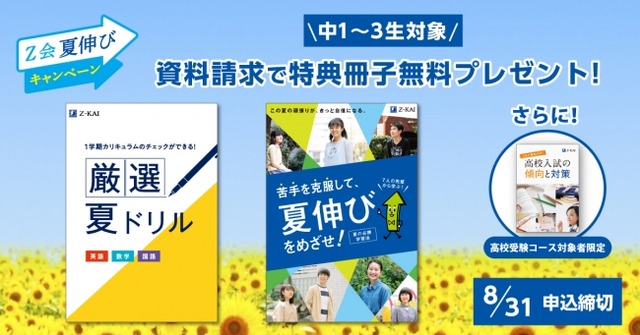 株式会社増進会ホールディングス(Z会グループ)のグループ会社である株式会社Z会は、「Z会の通信教育」中学生向けコースにおいて、中1生~中3生を対象にした「Z会夏伸びキャンペーン」を実施中!新型コロナウィルスの影響で長期間休校となり、夏休みも短い。こんな経験したことのない夏をチャンスに変えて、大きく伸びていきたいと考えている中学生を応援します。1学期の学び残しの範囲も含めて復習できるドリルと、苦手を克服して大躍進した先輩やZ会ベテラン講師のアドバイスをまとめた学習情報誌を無料でプレゼント! Z会中学生向けコースの資料と一緒にお届けしますので、ぜひこの機会にZ会中学生向けコースの資料を請求してみませんか?