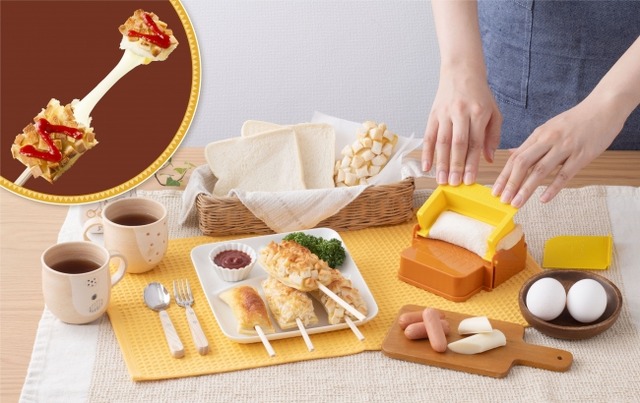 「のびのびチーズドッグ」は、食パンやチーズ、ソーセージなど手軽に用意できる食材でチーズドッグが作れるクッキングトイです。作り方は、1.本体に食パンとチーズ、ソーセージをセットし、2.レバーを手前にたおしベースを作ります。3.作ったベースに卵液とカットしたパンの耳をまぶして、4.220℃のオーブンで約10分焼きます。4.焼きあがったベースに割り箸などをさしてお好みの味付けをしたら完成です。