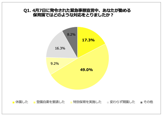 「Q1. 4月7日に発令された緊急事態宣言中、あなたが勤める保育園ではどのような対応をとりましたか?」(n=98)と質問したところ、「休園した」が17.3%「登園自粛を要請した」が49.0%となりました。
