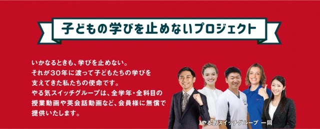 やる気スイッチグループは、「全世界一人ひとりの"宝石"を見つけること、そしてそれを輝かせることを全力でサポートし、人々が"やる気スイッチ"を入れ、"自分力"を発揮しながら幸せに生きる社会の創造に貢献する。」というグループ理念を掲げております。新型コロナウイルスの感染拡大に伴う休校期間中においても、この「子どもの学びを止めないプロジェクト」を通じて、会員の学習機会が失われないよう、サポートを続けてまいります。