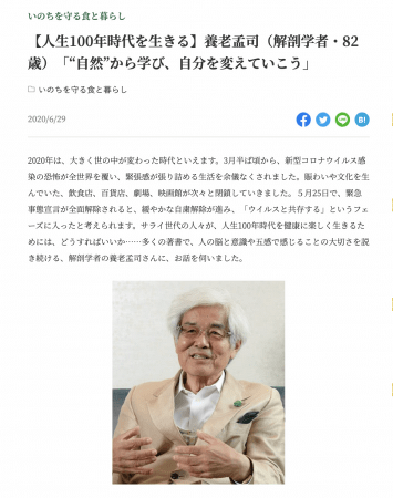 第1回目のゲストは養老孟司さんにご出演頂き、人生100年時代の生き方について、語って頂いています。