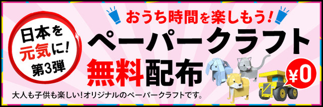 令和2年5月18日より行ってまいりました「日本を元気に!企画」の第三弾として、親子で楽しめるペーパークラフトPDFの無料配布を実施いたします。新型コロナウイルスの影響で、自宅で過ごすことが多くなったお子様と親御様に少しでも楽しい時間を過ごしていただきたいと企画いたしました。