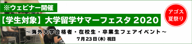 海外トップ大学・大学院留学準備指導校を運営する株式会社アゴス・ジャパン(代表取締役:横山 匡、本社:東京都渋谷区)は、2020年7月23日(木・祝)に、ハーバード大学、スタンフォード大学、イェール大学、スミスカレッジ、ポモナカレッジ等、欧米総合大学・リベラルアーツカレッジトップ校に現在海外大学に留学中の在校生、今秋から進学する学生が参加するウェビナー「大学留学サマーフェスタ2020」を開催いたします。