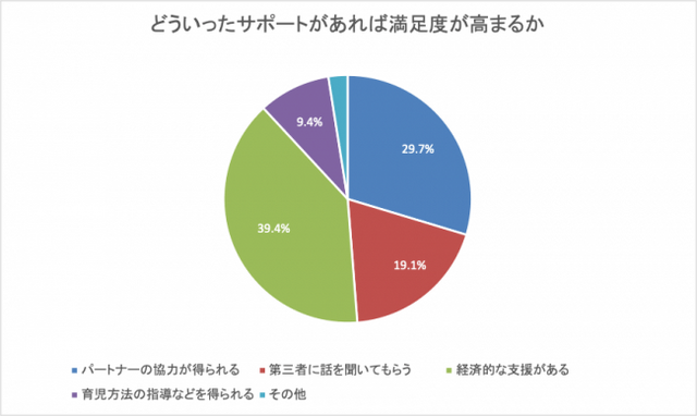 どういったサポートがあれば満足度が高まるか尋ねたところ、「経済的な支援」が39.4%で最も高く、次いで「パートナーの協力が得られる」29.7%、「第三者に話を聞いてもらう」19.1%となりました。