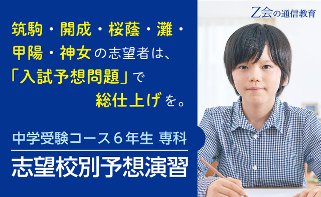 Z会が近年の入試傾向を徹底分析して練り上げた予想問題(各3回・添削指導付き)に取り組み、埋めておくべき穴を確実に発見・攻略しておくことで、自信をもって本番に臨むことができます。