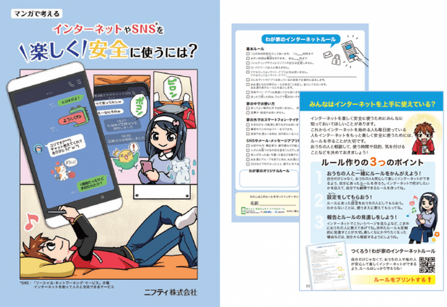 冊子内のマンガのストーリーは、無料通話アプリを利用時のトラブルを題材としており、どうしたらトラブルを回避することができたのか、自分だったらどうするかを子どもたち自身に考えてもらう内容となっています。また、安全にインターネットを使うためのルール作りのポイントや、ルール決めの際に活用できるルールの項目なども盛り込んでいます。