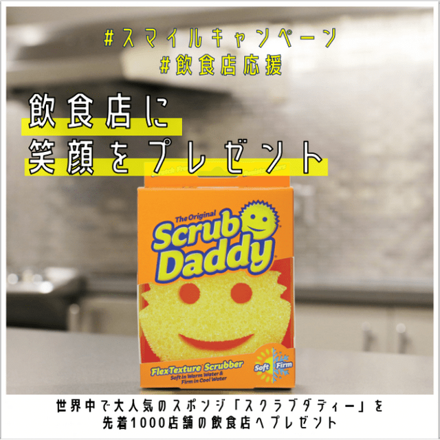 株式会社ヤギが日本での輸入代理店業務を行う「 Scrub Daddy (R) (スクラブダディー)」シリーズは、アメリカ生まれの、世界中で大人気の魔法のスポンジです。 水温で固さが変わる特殊素材で傷が付きにくく、長く清潔に使えて、可愛い見た目に加えて機能性も兼ね備えています。この「 スクラブダディー 」シリーズが、 全国の飲食店を応援するキャンペーンを開催しています。ご応募いただいた店舗に先着で、実際に使用していただけるスクラブダディー製品セットをプレゼント、飲食店に笑顔をお届けいたします。