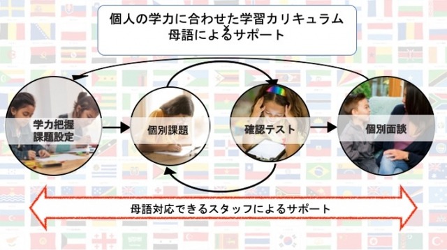本事業では、外国にルーツを持つ子どもたち*に向け日本語・各教科の学習機会を提供するとともに、独自のサポート体制による高い学習効果を提供します。