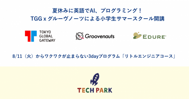 子どもでも遊ぶように学べるAIプログラミングをはじめ、最新テクノロジーを駆使した教育事業「TECH PARK(テックパーク)」を展開する株式会社グルーヴノーツ(本社:福岡県福岡市、代表取締役会長:佐々木久美子、以下 グルーヴノーツ)は、東京都教育委員会と株式会社TOKYO GLOBAL GAYEWAY(本社:東京都江東区、代表取締役社長:土坂恭司)が提供する体験型英語学習施設「TOKYO GLOBAL GATEWAY - TGG(東京都英語村)」において、TGGスクール by LCA「リトルエンジニアコース」を2020年8月11日(火)より開始いたしますのでお知らせします。