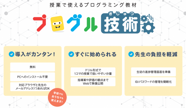 「プログル技術」は学校現場の限られたインフラやリソースでも活用でき、教育的効果の高いプログラミング教材として、全国の中学校・教育機関向けに無償で提供されます。教材の提供にとどまらず、実際の授業で活用しやすいように、指導案やワークシート、教室のスクリーンやTV画面などに投影して使っていただく授業スライドなども合わせて提供します(一部のコンテンツは、7月23日開催のリリースイベントにてお披露目します)。