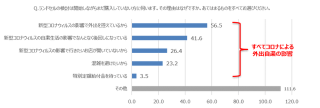 5月の調査時点で、検討しているがまだ購入には至っていない方の多くが、その理由を新型コロナウイルスによる影響で「外出を控えている/なんとなく後回しになっている/お店が開いていない」ためと答えました。特に「混雑を避けたいから」という理由で購入に至っていないと回答した方は昨年の同調査より約20%増え、ランドセル選びにも新型コロナウィルスの影響が生じたことが分かりました。