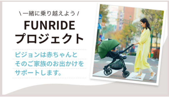 ピジョンは赤ちゃんとそのご家族に楽しくお出かけをしていただきたいと思っています。そんな私たちだからこそ、お出かけに不安を感じているママ達に寄り添い、一緒に乗り越えていくために何かできないかを考え「一緒に乗り越えようFUNRIDEプロジェクト」を立ち上げました。