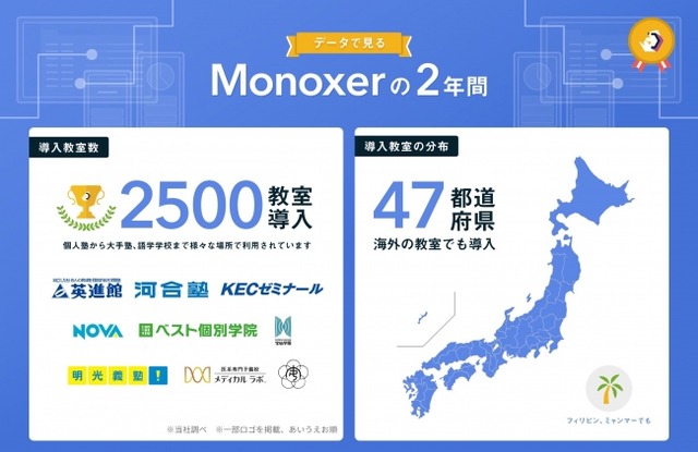 モノグサ株式会社(東京都千代田区 代表取締役:竹内孝太朗 畔柳圭佑)の提供する学習プラットフォーム「Monoxer」の導入教室数が2,500教室を突破し、累計の学習回数も1億回を突破いたしました。