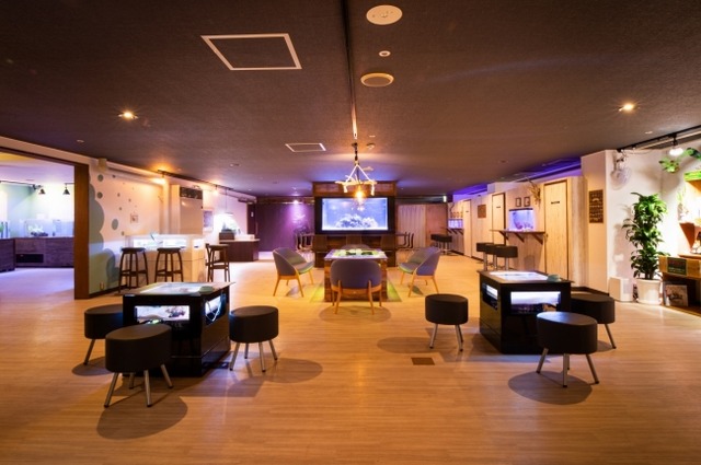 全体的に落ち着いた雰囲気の中におしゃれな展示水槽が並んでおり、それぞれの水槽には座り心地の良い椅子を設置しており、時間を忘れてリラックスできます。
