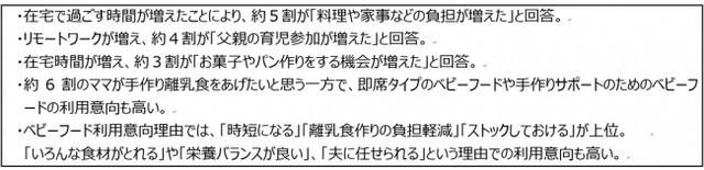 アサヒグループ食品では、新型コロナウイルスの感染拡大により、新しい生活様式が生まれている中、ベビーフードについての意識調査を実施しました。その結果、父親の育児参加の増加やお菓子・パン作りの増加など、家で過ごす時間が増えたことによる生活の変化が分かりました。