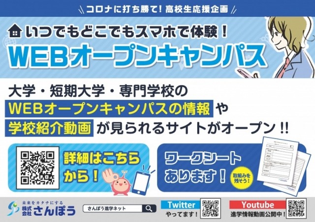 そのような中、株式会社さんぽうは大阪支社を中心に「自宅で体験!WEBオープンキャンパス」を開設、現在近畿圏の学校を中心に約40校のWEBオープンキャンパスを掲載している。学校紹介や学部学科情報、入試に関する最新情報はもちろん、各学校それぞれの特色や学びの特徴、キャンパス・設備施設、学生生活などコンテンツごとに動画で見ることができる。またスマートフォンからも手軽にアクセスでき、保護者も一緒に視聴することができる絶好の機会となっている。さらにWEB上であれば県外や遠方の高校生にとって複数の学校を比較しやすいうえ、視聴後の印象や感想をまとめることができるワークシートも無料ダウンロードできるので、志望校への理解を深めながら吟味することができ、入学前と後のミスマッチの防止に役立つことも期待される。