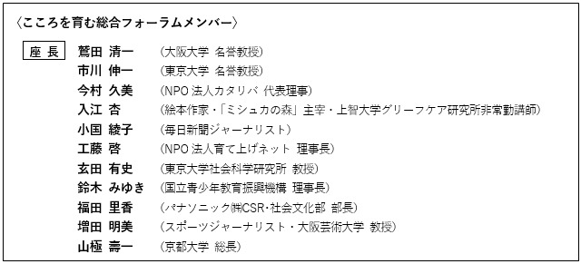 「こころを育む総合フォーラム」は、2005年に弊財団の新たな事業として発足し、経済界、学会、等を代表する有識者16名のもと、子どもたちのこころを育むための提言書の発刊やシンポジウムを行ってまいりました。