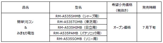 株式会社JVCケンウッドは、JVCブランドより、リモコンのIoT化を実現する商品として、国内テレビメーカー各社に対応する簡単リモコン&みまもり電池「RM-A535SHMB」「RM-A535TOMB」「RM-A535HIMB」「RM-A535PAMB」「RM-A535SOMB」の計5モデルを7月下旬より発売します。
