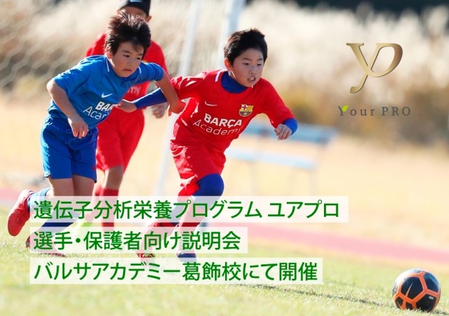 7月23日(木)、株式会社キーマイン(代表取締役 長峯誠 神奈川県横浜市 )は、一般財団法人キッズチャレンジ未来(理事長 秋元雅義 東京都葛飾区)が展開するバルサアカデミー葛飾校(FCバルセロナ公認サッカーアカデミー)にて、遺伝子分析栄養プログラム~YourPRO~(以下:ユアプロ)の選手・保護者向け説明会を開催する。
