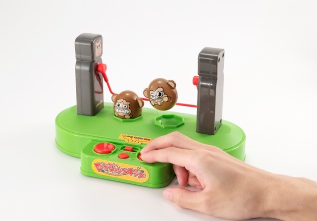 本商品は、サルが大縄跳びで何回跳べるかを競うアクションゲームです。本体はサウンド機能を搭載しており、“レディーゴー“という音声を合図にロープが回り始めるので、さるがロープにあたらないようにタイミングよくジャンプさせます。1人で何回跳べるか挑戦したり、2人でどちらが長く跳べるか競ったりと遊び方も様々で、プレイ中に流れる軽快なBGMがゲームをより一層盛り上げます。