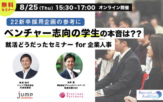 株式会社プレシャスパートナーズ(本社:東京都新宿区、代表取締役社長:高崎誠司)は、ジャンプ株式会社(本社:東京新宿区、代表取締役:増渕知行)と共同でオンラインセミナーを開催いたします。