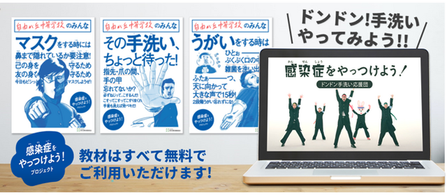 教材は、応援団と一緒に”感染症をやっつける”という楽しい演出の動画とポスターで、感染症予防に大切な「手洗い・うがい・マスク」を子どもたちが自らやってみようと思える内容になっています。