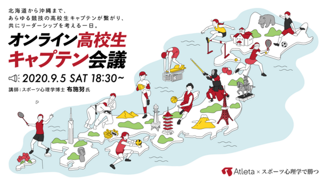 (株)エムティーアイが提供する、スポーツチームをサポートするコンディショニングノート『Atleta(アトレータ)』は、スポーツ心理学博士の布施努氏を招き、全国のあらゆる競技の高校生キャプテンを対象に“リーダーシップ”をテーマとしたオンラインセミナー「オンライン高校生キャプテン会議」を9月5日(土)に開催します。