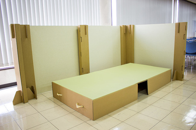 このダンボールベッドの上に「くつろぎシリーズ 防炎タイプ」を2枚並べると縦2m×横1mとなり、成人男性1人でもストレスなく横になることができ、組み立ても箱を広げるだけと非常に簡単なことから、避難所設営もスムーズなものとなる。