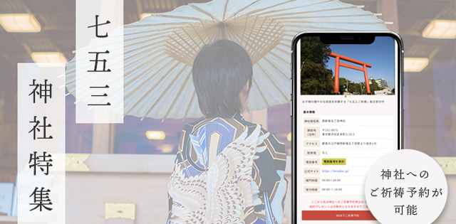 七五三のご祈祷希望者が神社に事前のご祈祷予約ができる機能と、七五三祈願ができる神社情報を提供する特集です。