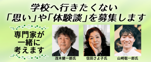 ニコニコ生放送番組「明日、学校へ行きたくない」は、8月24日(月)19時から第1部をお届けします。第1部では、寄せられた投稿を山崎聡一郎さんが朗読します。第2部では茂木健一郎さん、信田さよ子さん、山崎聡一郎さんが、学校生活の悩みや新型コロナウイルスの影響などについて、視聴者のみなさんと一緒に考えます。