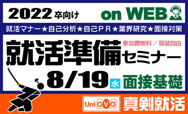 UniLife(ユニライフ)のブランドで全国の学生マンションの企画開発・仲介斡旋・運営管理までをトータルで行う株式会社ジェイ・エス・ビーのグループ企業である株式会社OVO((株)オーヴォ 京都市下京区 代表取締役社長 小管 香織)は、2022年卒の就活生を対象とした少人数型就活スタートアップオンラインセミナー「2022卒【真剣就活】オンラインセミナー」を完全無料でオンライン開催します。2020年8月19日(水)に開催する第一回プログラム「まずはここから!【面接対策の基礎】 」では、面接をテーマに面接の基本はもちろん、最近急増するオンライン面接への対策を解説します。