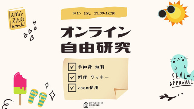 「家族も知らなかった才能が花開くクッキングスクール」を提供するリトルシェフクッキング株式会社(本社:東京都世田谷区、代表取締役社長:武田昌美、以下「リトルシェフクッキング」)は8月15日(土)、新型コロナウイルスの影響で在宅時間が長くなってしまった、全てのお子様方の「好き」への探求心を止めない、夏休みオンライン自由研究を参加費無料で行うことをお知らせ致します。