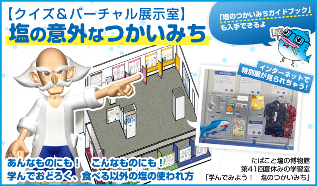 『学研キッズネット』の「【クイズ&バーチャル展示室】塩の意外なつかいみち」(https://kids.gakken.co.jp/kagaku/nandemo/shionotsukaimichi/)では、実際の特別展の見取り図と展示物(一部)を写真で見ることできます。また、塩のさまざまな使いみちをクイズで楽しく学べるコーナーも掲載。食品以外に使われている塩の意外な使いみちが、親子で楽しく学べるようになっています。