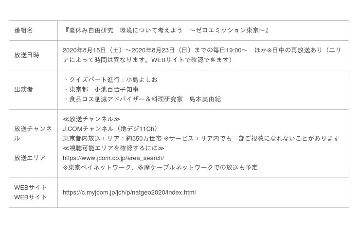 番組は、夏休み期間中の子どもたちに向けて、2020年8月15日(土)から2020年8月23日(日)までの毎日19時から※東京都内の「J:COMチャンネル」(地デジ11Ch)で放送するほか、J:COM が提供する地域情報アプリ 「ど・ろーかる」では2020年8月15日(土)から2020年9月30日(水)まで配信しますので、スマートフォンやタブレットから無料で何度でもご視聴できます。 ※日中の放送もあり