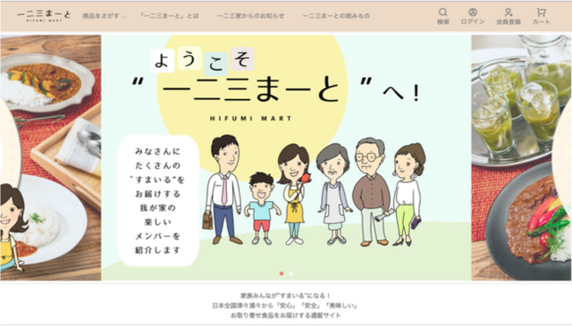 「一二三まーと」では、多様化する家族をイメージしやすいように「6歳の息子がいる主婦の一二三秋子(架空キャラクター)」を中心とした『一二三一家』をブランドキャラクターとして設定し、家族の“すまいる”をテーマにそれぞれのキャラクターに合った商品やレシピを紹介するECサイトです。