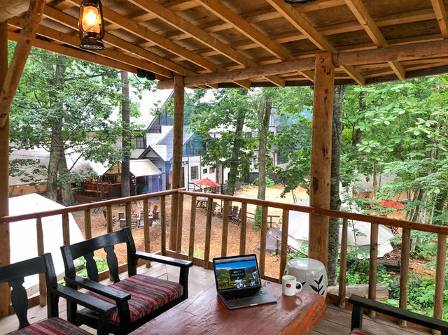 また、リゾートホテル・グランピング施設併なので、大型テントの下やツリーハウスの上で、食事を楽しみながらテレワークも可能。雨の日も屋内またはテントの下でワークテーブル、Wifi、電源などが利用できる。ホテルの施設を利用したリゾートテレワーク宿泊プランを販売しているため、「お父さんはお仕事、お子様は遊び」といった滞在ができる。