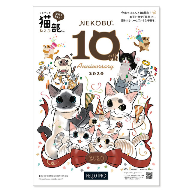 フェリシモが展開する「フェリシモ猫部(TM)」は、2020年9月28日に創部10周年を迎えるにあたって、これまでの猫部の歴史やさまざまなプロジェクト、おすすめ商品などが掲載された10周年記念カタログを発刊しました。また、10周年を記念して作られた「フェリシモ猫部10周年メモリアルプレート」のウェブ販売も8月18日より開始しています。猫部の人気アイテムでもおなじみの山野りんりんさんが描き下ろした猫たちが、お皿のふちにぐるりと並んだ愛らしいデザインで、インテリアとして、また猫部員の証としてお部屋に飾れるスタンドも付いています。猫部の活動を応援してくださる全国の猫部員のみなさまへの感謝の気持ちを込めた逸品です。金の箔押しロゴの入った豪華な箱入りなので、猫好きさんへの贈りものとしてもおすすめです。販売価格の一部は飼い主のいない動物の保護と里親探し活動、野良猫の過剰繁殖防止活動、災害時の動物保護活動などに活用されます。