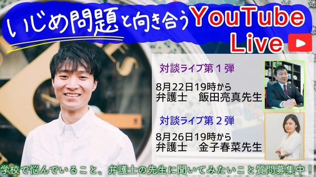 合同会社Art&Arts代表社員で「こども六法」著者の山崎聡一郎が運営するYouTubeチャンネル「やまそーチャンネル」にて、8月22日と26日の二回にわたり、「いじめと向き合うYouTubeライブ」を実施します。
