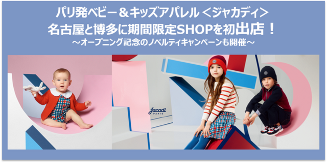 コーンズ・アンド・カンパニー・リミテッド(所在地:東京都港区、代表取締役社長:渡 謙作)が展開する、パリ生まれのキッズ&ベビーアパレルブランド「ジャカディ」は2020年9月、名古屋と博多に期間限定SHOPをオープンします。