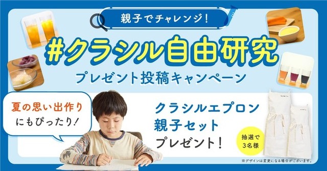 「#クラシル自由研究」のハッシュタグと一緒に、実験の様子やできた料理(ドリンクやシャーベットなど)を投稿すると、抽選でクラシルの特製エプロン(大人サイズと子どもサイズ・各1枚ずつ)をプレゼントします。