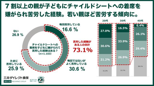 ・1,103人の親のうち、7割以上(73.1%)が、子どもにチャイルドシートへの着席を嫌がられ、苦労をした経験があると回答しました。