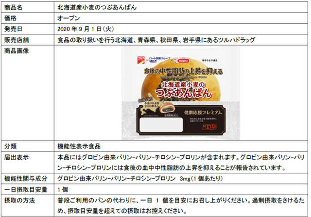 株式会社ツルハホールディングス(本社:北海道札幌市、代表取締役社長執行役員:鶴羽順)及びロート製薬株式 会社(本社:大阪府大阪市、代表取締役社長:杉本雅史)の子会社であるエムジーファーマ株式会社(本社:大阪府 茨木市、代表取締役:墨田康男)、日糧製パン株式会社(本社:北海道札幌市、代表取締役社長:吉田勝彦)は、 日本初の機能性表示食品のあんぱん「北海道産小麦のつぶあんぱん」を共同で開発しました。本品は 2020 年 9 月 1 日、食品の取り扱いを行う北海道、青森県、秋田県、岩手県のツルハドラッグにて新発売いたします。