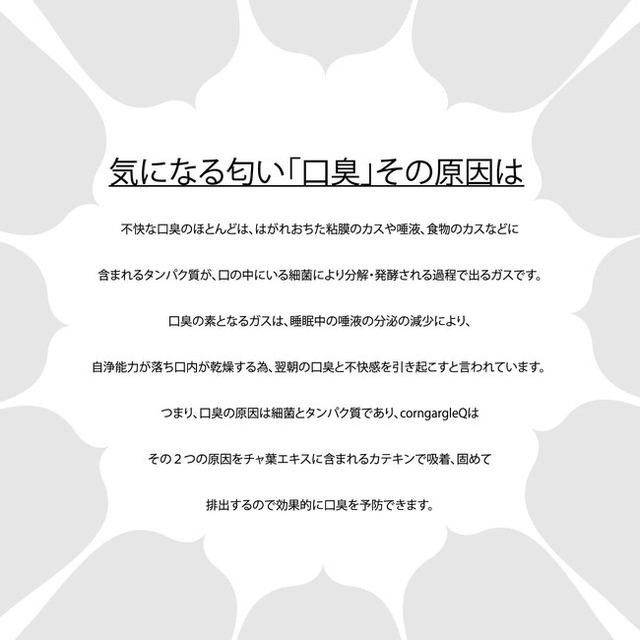 不快な口臭の原因は、はがれおちた粘膜のカスや唾液、食物のカスなどに含まれるタンパク質が、口の中にいる細菌により分解・発酵される過程で出るガスです。CORN GARGLE Q(コーンガーグルキュー)は口内のタンパク質と細菌をチャ葉エキスに含まれるカテキンで吸着、固めて排出するので効果的に口臭を予防でき、かつお口の汚れを目で見て実感できます。