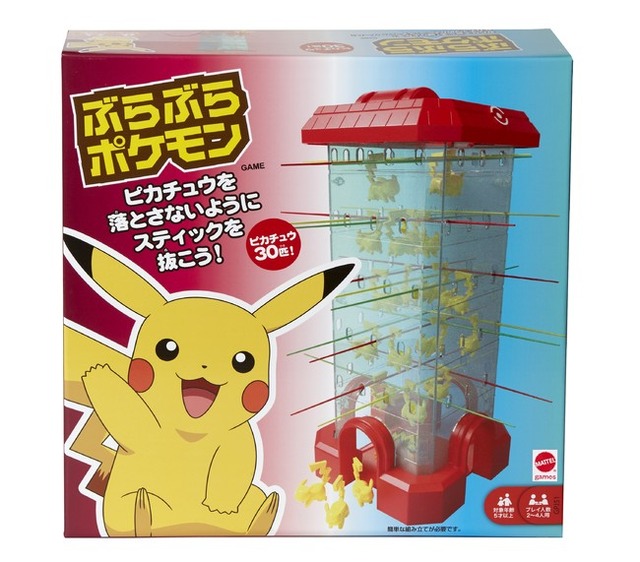 このたび発売される「ぶらぶらポケモン」は、スティックにぶらぶらとぶら下がっている30匹の小さくてかわいいピカチュウを落とさないようにスティックを抜いていくゲームです。サイコロを振って出た色のスティックを各プレイヤーが順番に抜いていき、ピカチュウを落とした数が一番少ない人が勝ちというシンプルなルールなので、幼いお子さんから大人まで、家族や友達みんなでワイワイ楽しむことができます。
