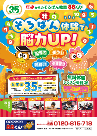 セイハネットワーク株式会社(福岡県福岡市,代表取締役:坂口 正美,以下セイハネットワーク)は、そろばん教室88くんにて「創業35周年」の感謝を込めて入学金が通常11,000円(税込)のところ期間限定で35円(税込)とさせていただきます。しかも今なら体験レッスンも「無料」で提供させていただきます。さらに体験レッスンを受講された生徒様は、体験特典として「オリジナル鉛筆」をプレゼントさせていただきます。まずは、無料体験レッスンを是非ご受講ください。