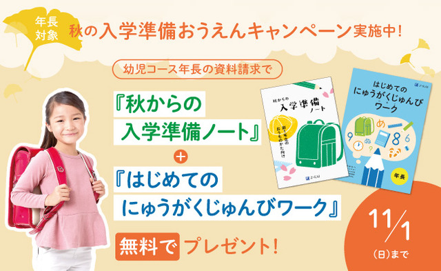 株式会社増進会ホールディングス(Z会グループ)のグループ会社である株式会社Z会は、「Z会の通信教育」幼児コース年長において、「秋の入学準備おうえんキャンペーン」を実施中です。Z会幼児コース年長の資料を11月1日(日)までにご請求いただいた方に、おうちの方向け情報誌『秋からの入学準備ノート』とお子さま向け『はじめてのにゅうがくじゅんびワーク』を無料で差し上げます。