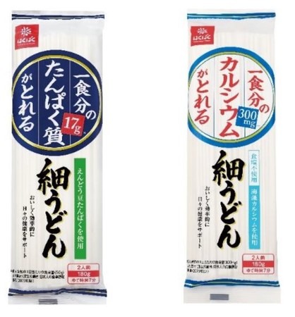 穀物のリーディングカンパニー株式会社はくばく(本社:山梨県中央市、代表取締役社長:長澤 重俊)は、栄養が不足しがちな乾麺に、必要な栄養をギュッと詰め込んだ『栄養サポートめんシリーズ』として「一食分のたんぱく質がとれる細うどん」と「一食分のカルシウムがとれる細うどん」の2品を9月1日(火)より発売いたします。